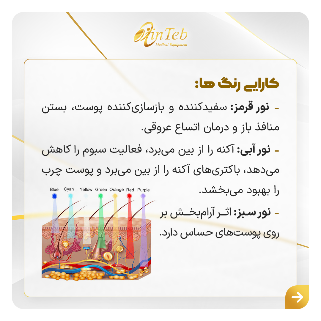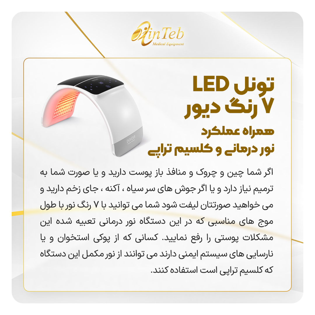 دستگاه مذکور سبب نور درمانی می شود و دارای 7 طول موج مختلف می باشد ویکی از  بهترین ابزارهای مراقبت پوست محسوب میشود.