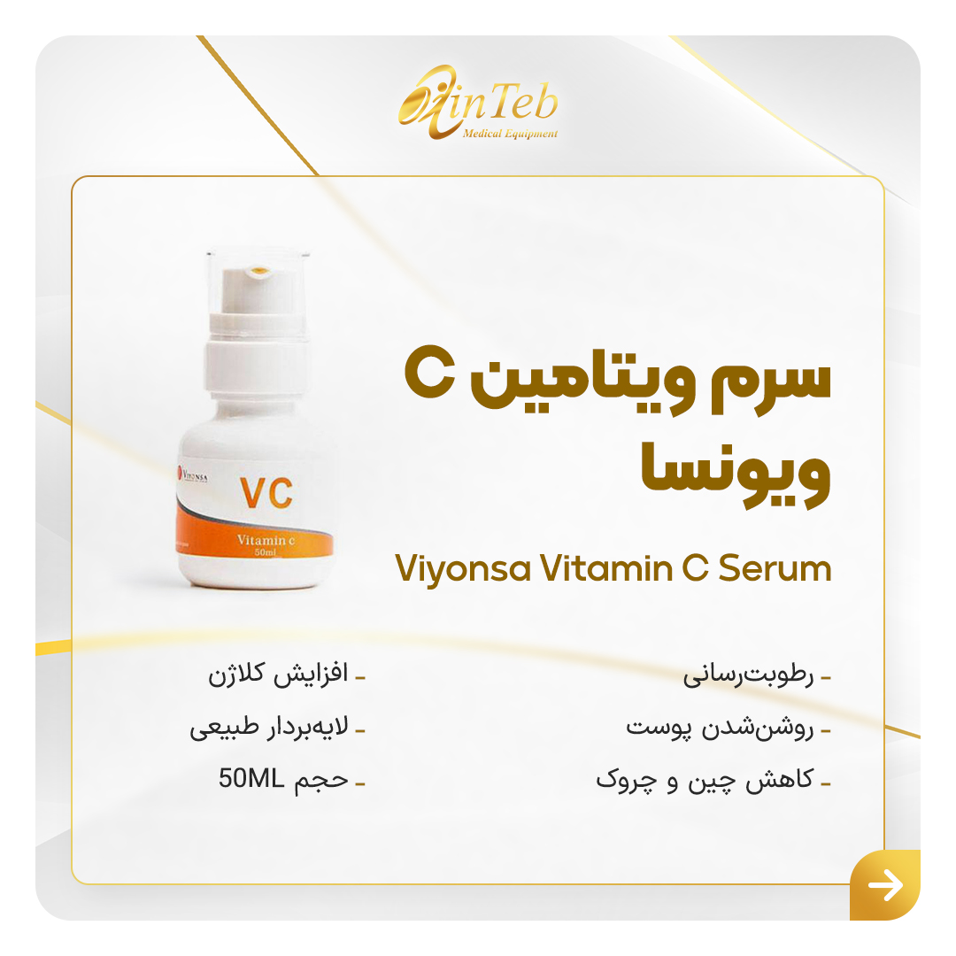 سرم ویتامین سی ویونسا حجم 50 میل به لطف داشتن ویتامین سی در ترکیب خود، با خستگی، استرس و پیری پوست مقابله نموده ، رطوبت و شادابی و شفافیت را به پوست های کدر بر می گرداند.  سرم ویتامین سی ویونسا به سرعت جذب پوست می شود. با مصرف این محصول روز به روز به شادابی و صافی پوست افزوده خواهد شد. وجود مجموعه آنتی اکسیدان های قوی در این محصول، نه تنها از پوست در برابر آسیب های ناشی از UV و رادیکال های آزاد محافظت می نماید، بلکه سبب ترمیم سریع، افزایش الاستیسیته، شفافیت و سفت شدن پوست های تحت استرس نیز می گردد. سرم ویتامین c پریم همچنین به انواع پوست ها تطابق پیدا می کند و می تواند سریعا جذب پوست شما شود. کلاژن ساز تعبیه شده درون این سرم به همراه ویتامین سی کلاژن سازی پوست شما را تحریک می کند و پوستی شاداب تر را به شما می بخشد.