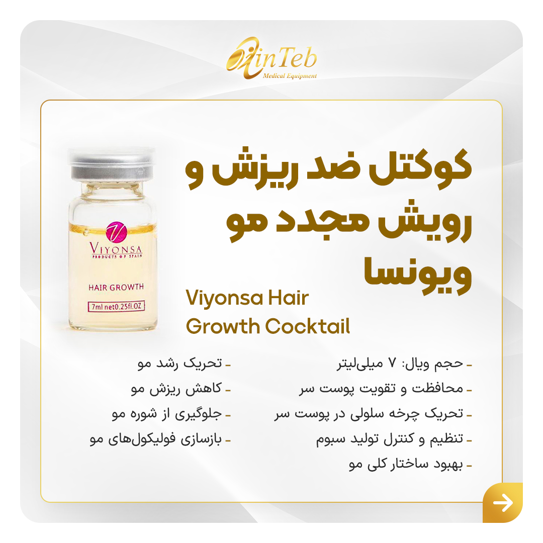 کوکتل ضد ریزش و رویش مجدد مو ویونسا viyonsa برای مو طراحی شده و می تواند گردش خون را در مویرگ های مو را افزایش دهد و همین امر موهای شما را بسیار زیباتر می‌کند. بدون شک شما برای رشد کردن موهای خود به موادی نیاز دارید که رشد مو را تا حد زیادی افزایش دهد. در این صورت فولیکول های مو به خوبی تقویت می شوند و رشد آن ها هم افزایش پیدا می‌کند. تعداد استفاده از کوکتل ضد ریزش و رویش مجدد مو ویونسا viyonsa بستگی به حجم موهای شما دارد که خودتان بایدآن را به خوبی در نظر داشته باشید.